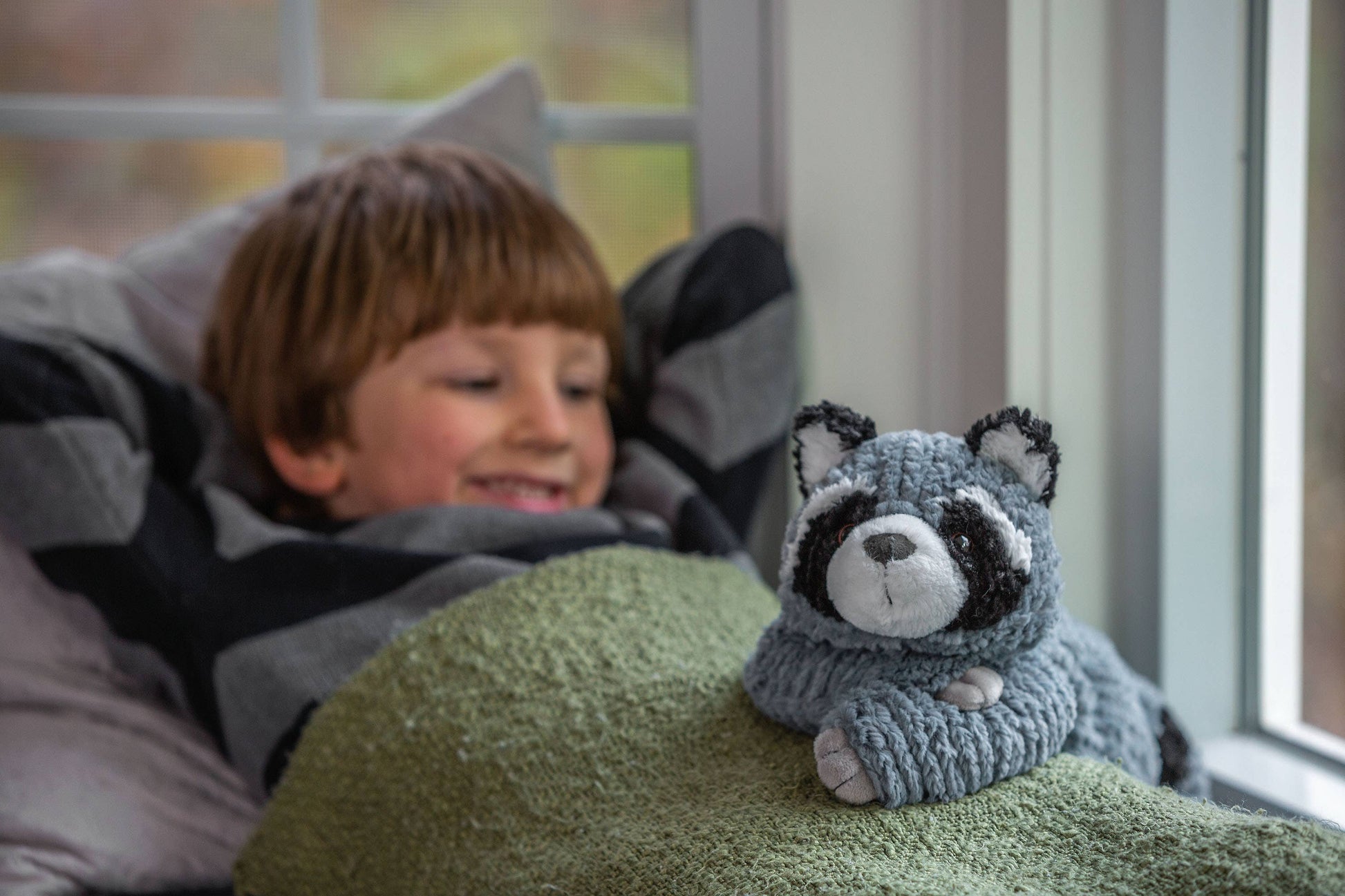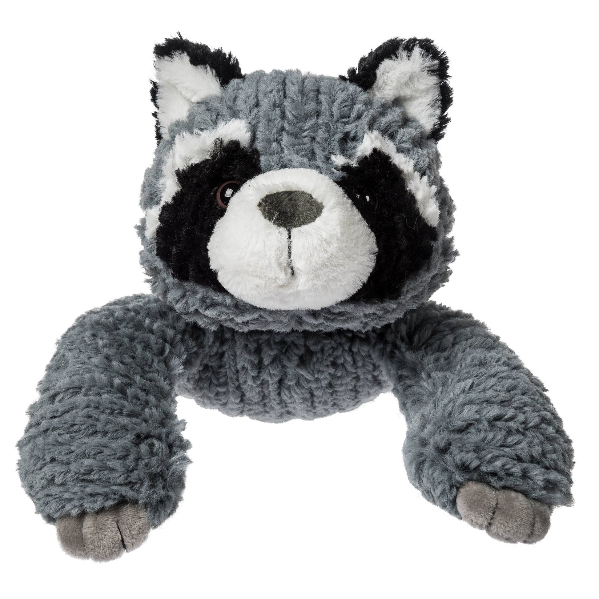 Cozy Toes Raccoon in slate blue fabric with black stripes on tail and around eyes; features white accents on face and soft grey paws.