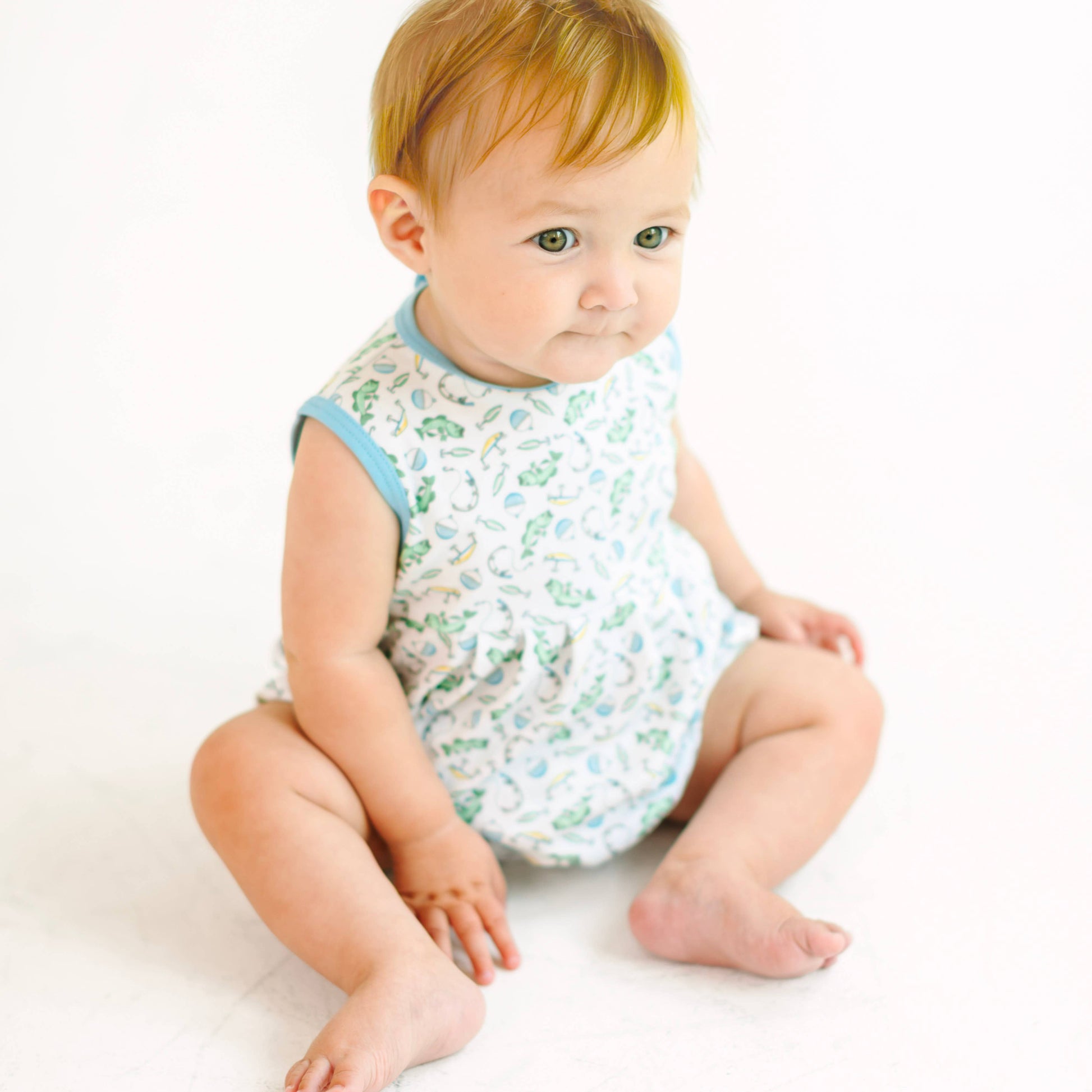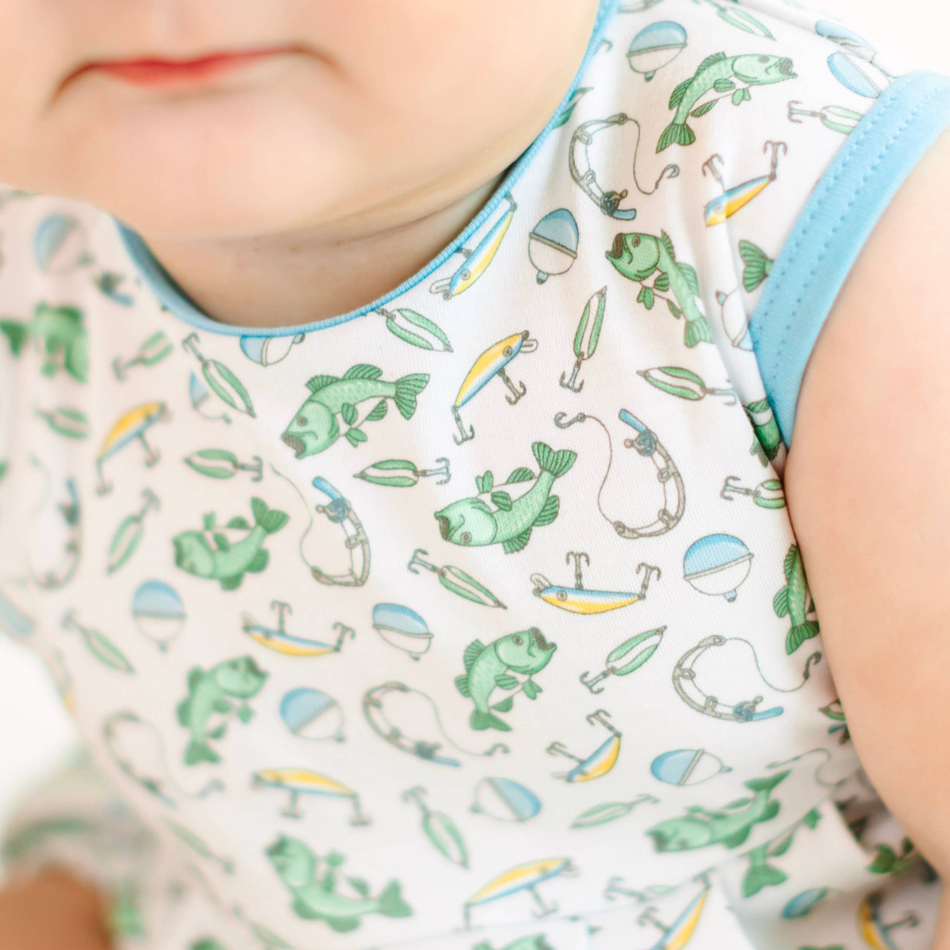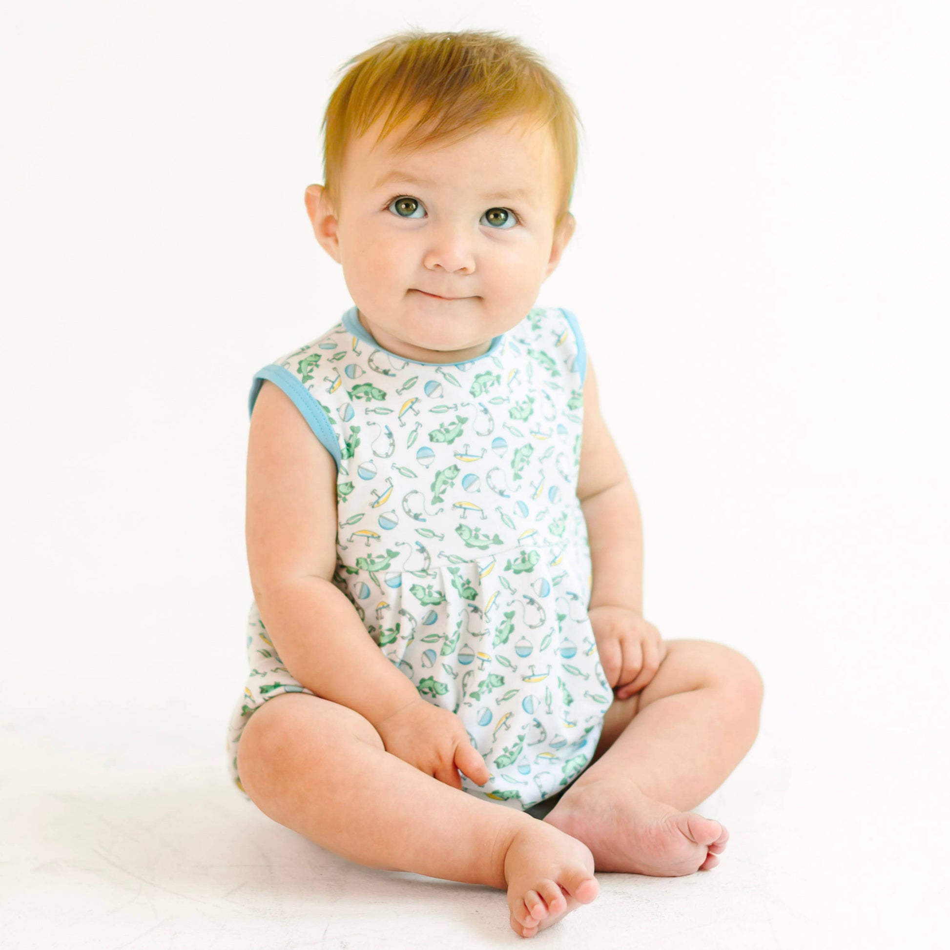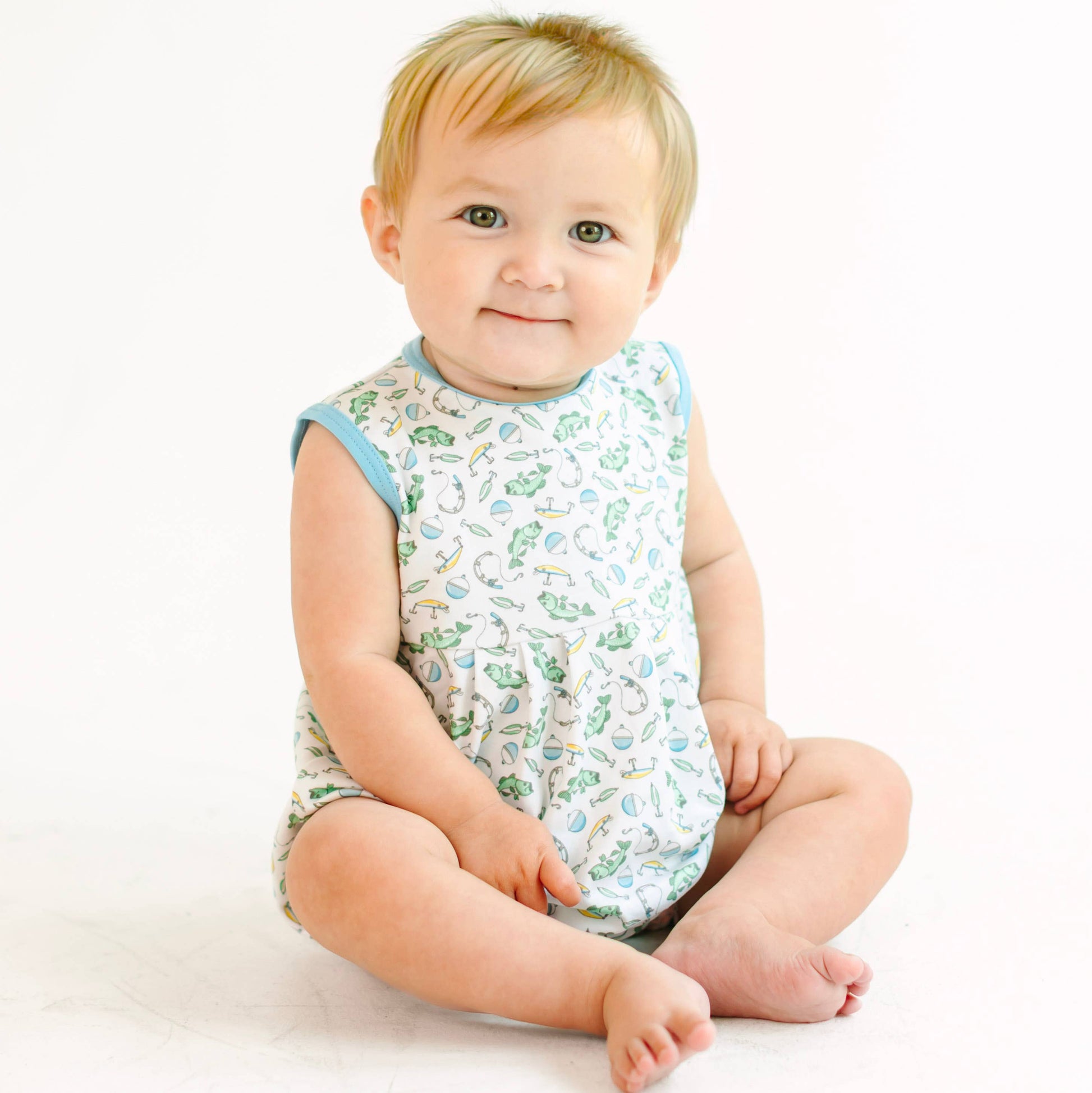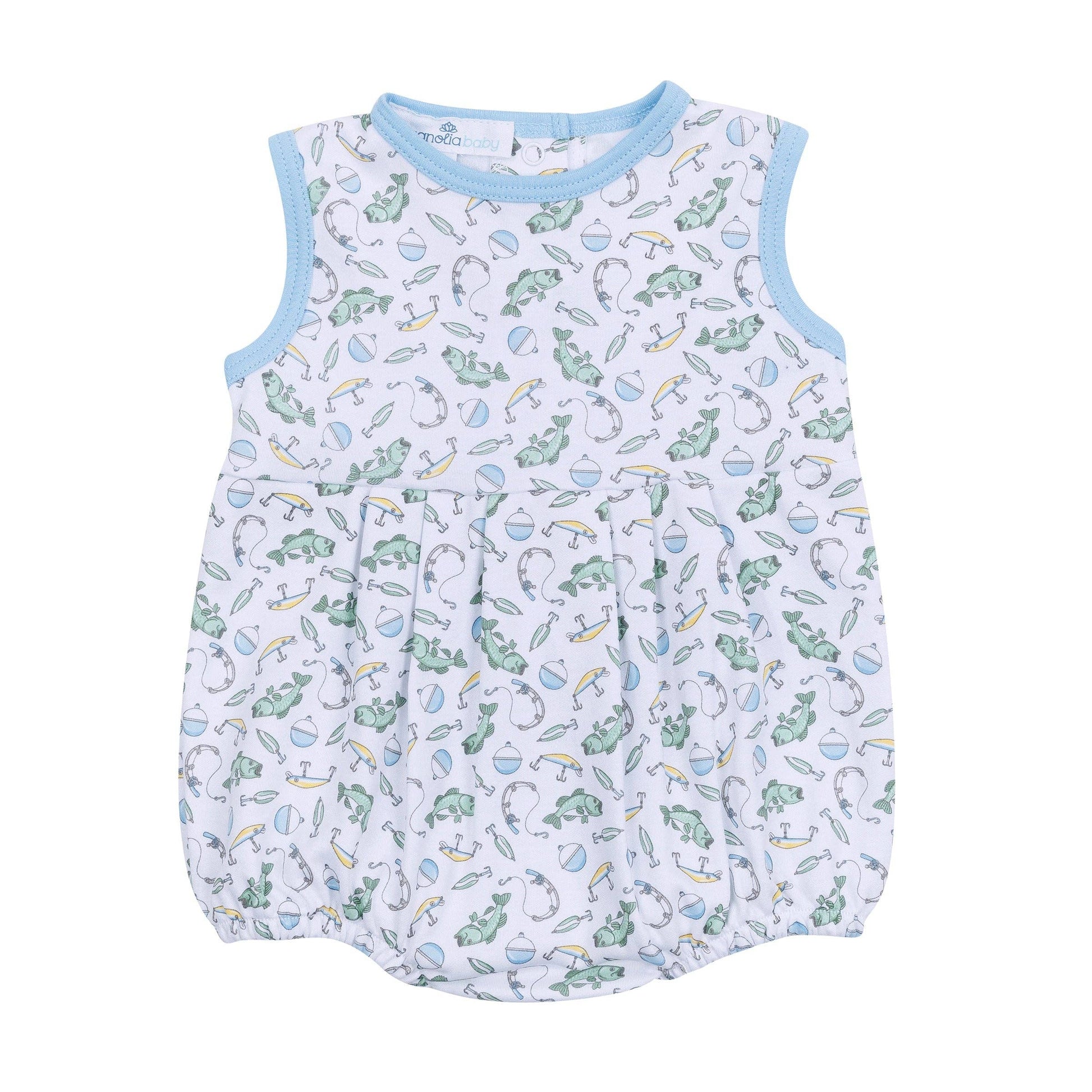 Picture your little one splashing around in this adorable bubble! Featuring a fun and playful print of fish and fishing gear, this piece captures the spirit of a day at the lake or the sea. Crafted from the most luxurious Pima Cotton, it's incredibly soft against baby's delicate skin and perfect for warm days.