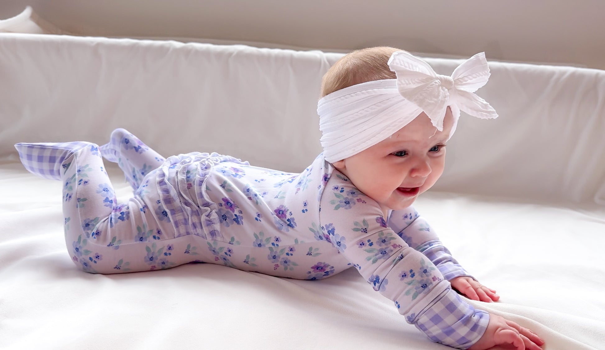 Introducing the Lilac Garden Ruffle Bamboo Sleeper, featuring 220 GSM bamboo fabric that is hypoallergenic and super stretchy. Bamboo fabric allows for months longer wear than traditional sleepers. Sleep peacefully with the ultimate comfort and durability.