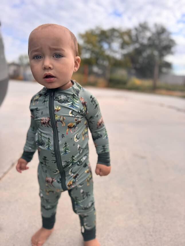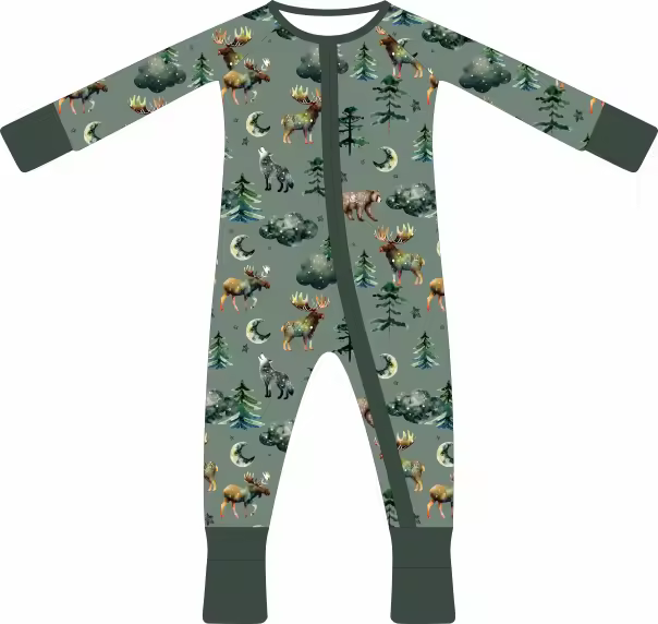 Introducing the Midnight Moose Bamboo Sleeper, featuring 220 GSM bamboo fabric that is hypoallergenic and super stretchy. Bamboo fabric allows for months longer wear than traditional sleepers. Sleep peacefully with the ultimate comfort and durability.