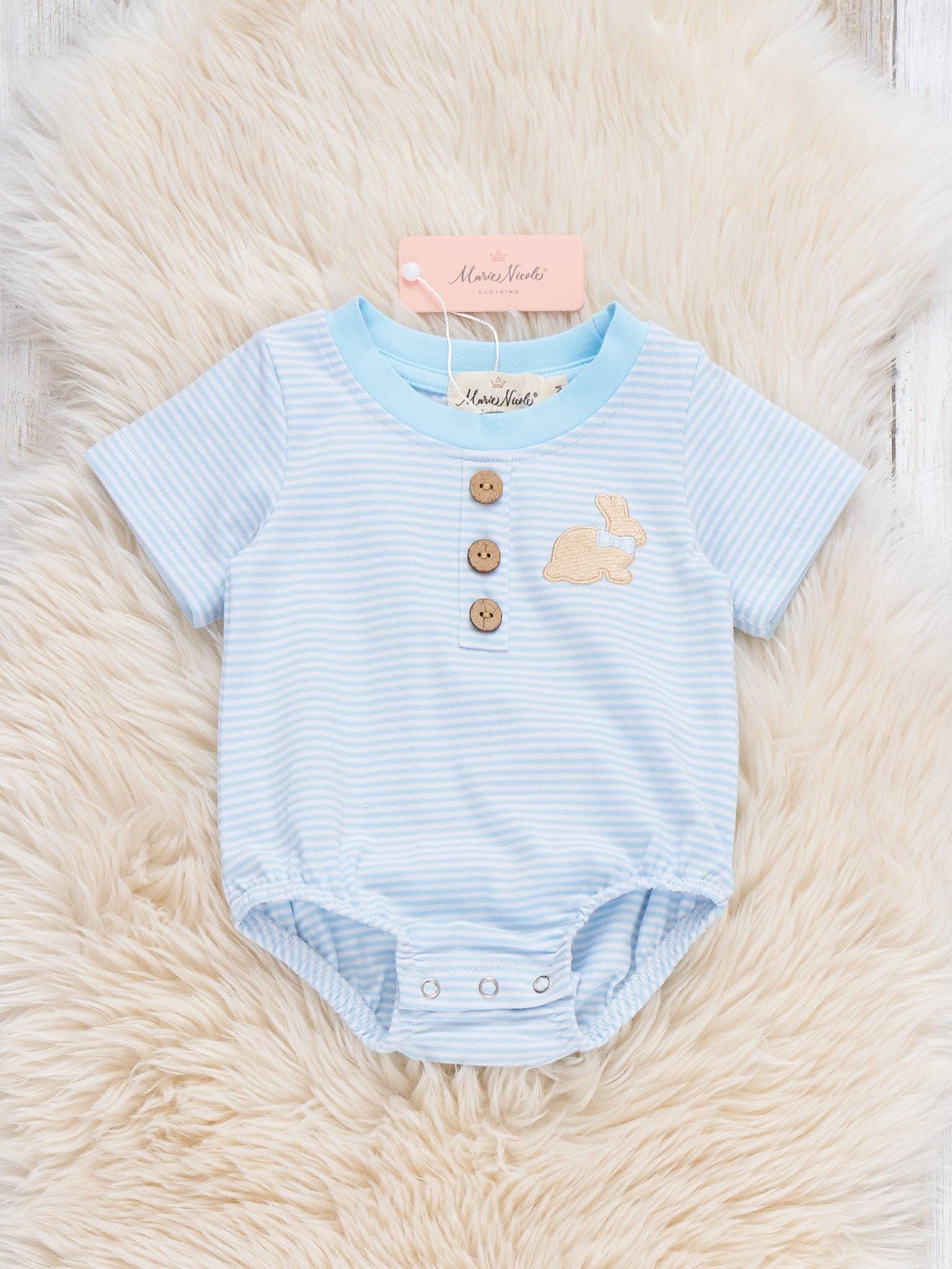 Picnic Hop Embroidered Cotton Romper by Marie Nicole Clothing. This romper features soft stripes, a buttoned placket on the chest, and an adorable embroidered bunny, making it a sweet and classic choice for spring and Easter occasions.
