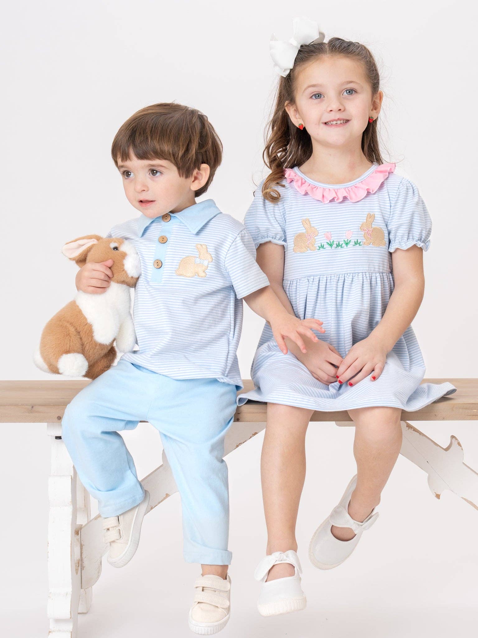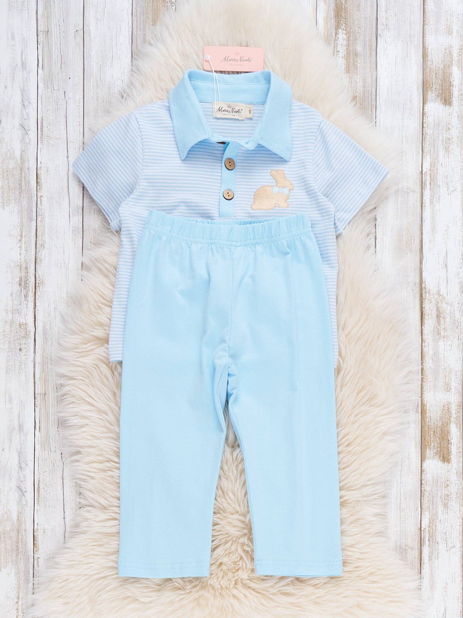 Picnic Hop Embroidered Cotton Outfit by Marie Nicole Clothing. This set features a short sleeve, buttoned polo-style top with pale stripes and a contrasting collar, accented by a small bunny embroidery, paired with matching solid pants for a polished, spring-ready look.