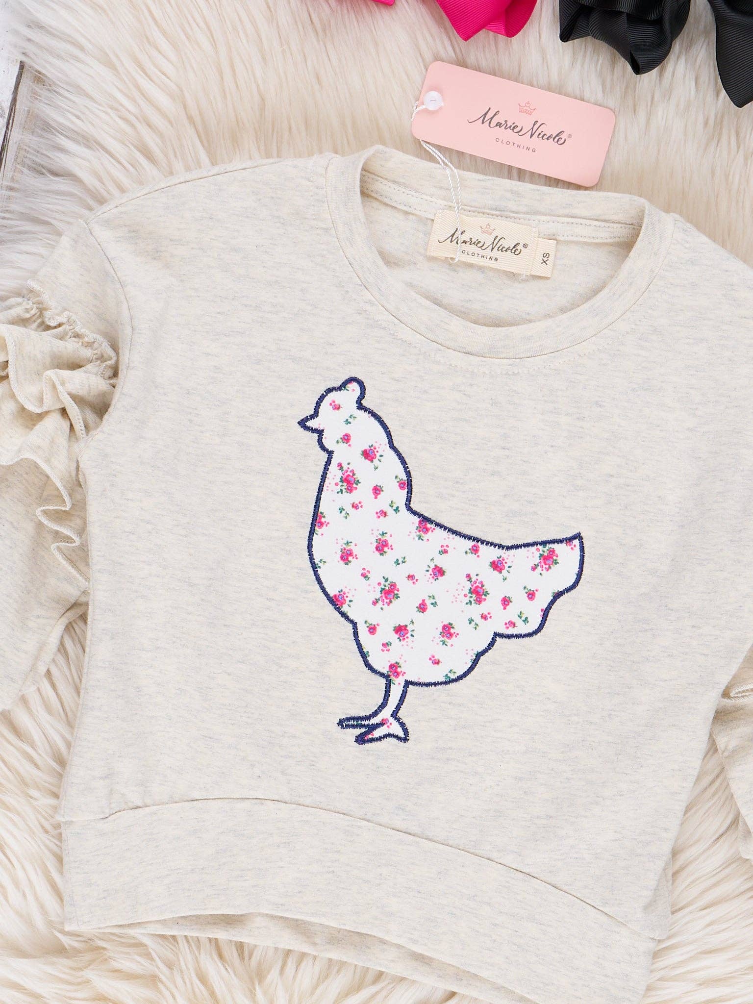 Your little one will have a hen party with this top! The grey super soft top features ruffle sleeve details and adorable embroidered navy and pink chicken in the center. * Fits true to size. * Body: 97% Cotton / 3% Spandex * Combo: 95% Polyester / 5% Spandex *